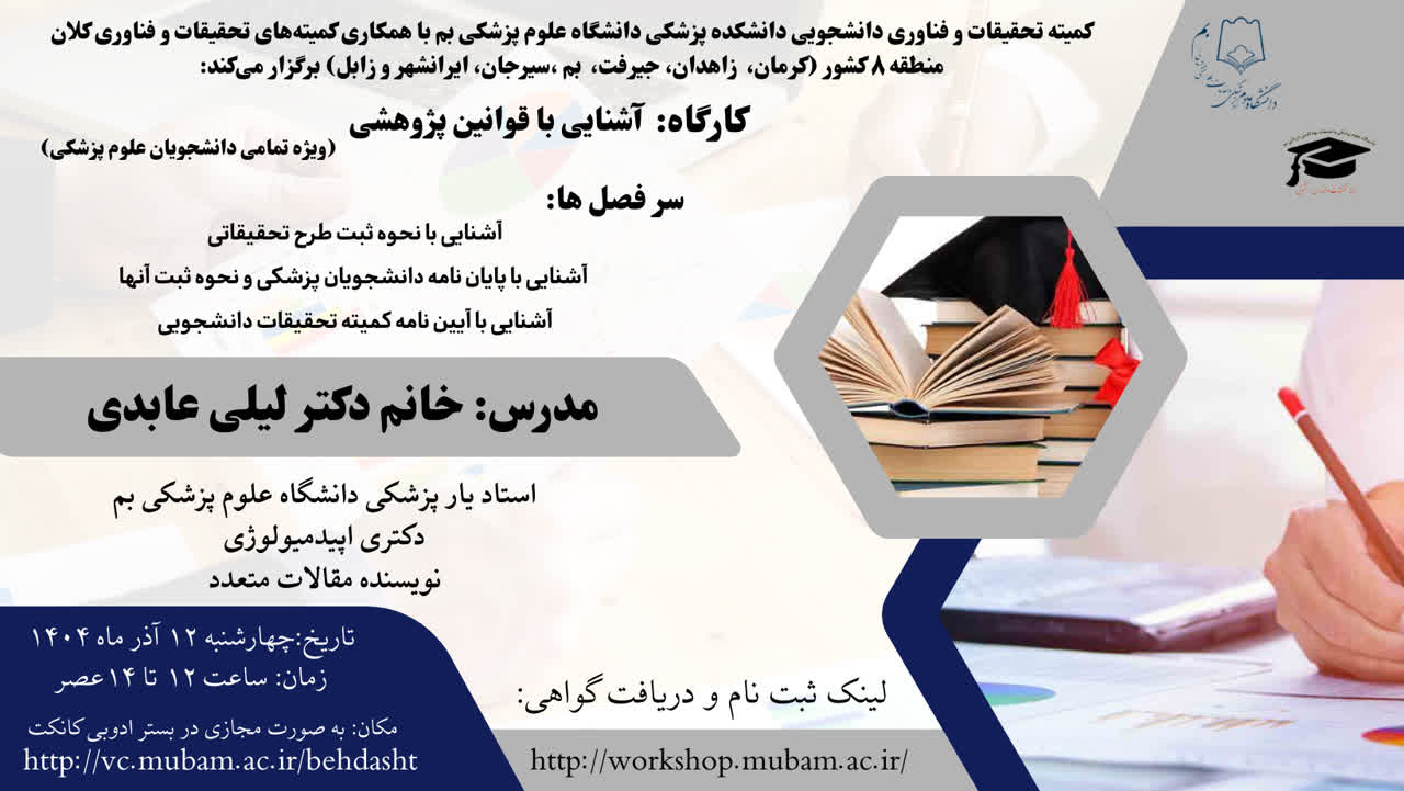کارگاه : آشنایی با قوانین پژوهشی (ویژه دانشجویان علوم پزشکی) عناوین کارگاه: آشنایی با نحوه ثبت طرح تحقیقاتی آشنایی با پایان نامه دانشجویان پزشکی و نحوه ثبت آنها آشنایی با آیین نامه کمیته تحقیقات دانشجویی مدرس: خانم دکتر لیلی عابدی استادیار پزشکی دانشگاه علوم پزشکی بم،دکتری اپیدمیولوژی، دارای مقالات متعدد