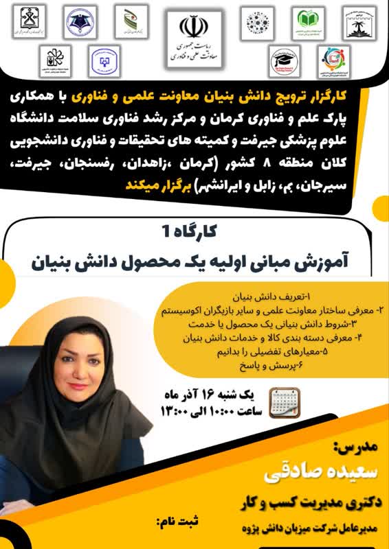 کارگزار ترویج دانش بنیان معاونت علمی و فناوری با همکاری پارک علم و فناوری کرمان و مرکز رشد فناوری سلامت دانشگاه علوم پزشکی جیرفت و کمیته های تحقیقات و فناوری دانشجویی کلان منطقه ۸ کشور ( کرمان، زاهدان، رفسنجان، جیرفت، سیرجان، بم، زابل، ایرانشهر) برگزار میکند: